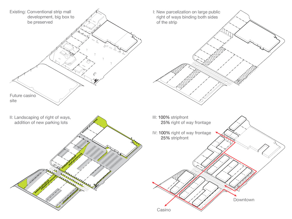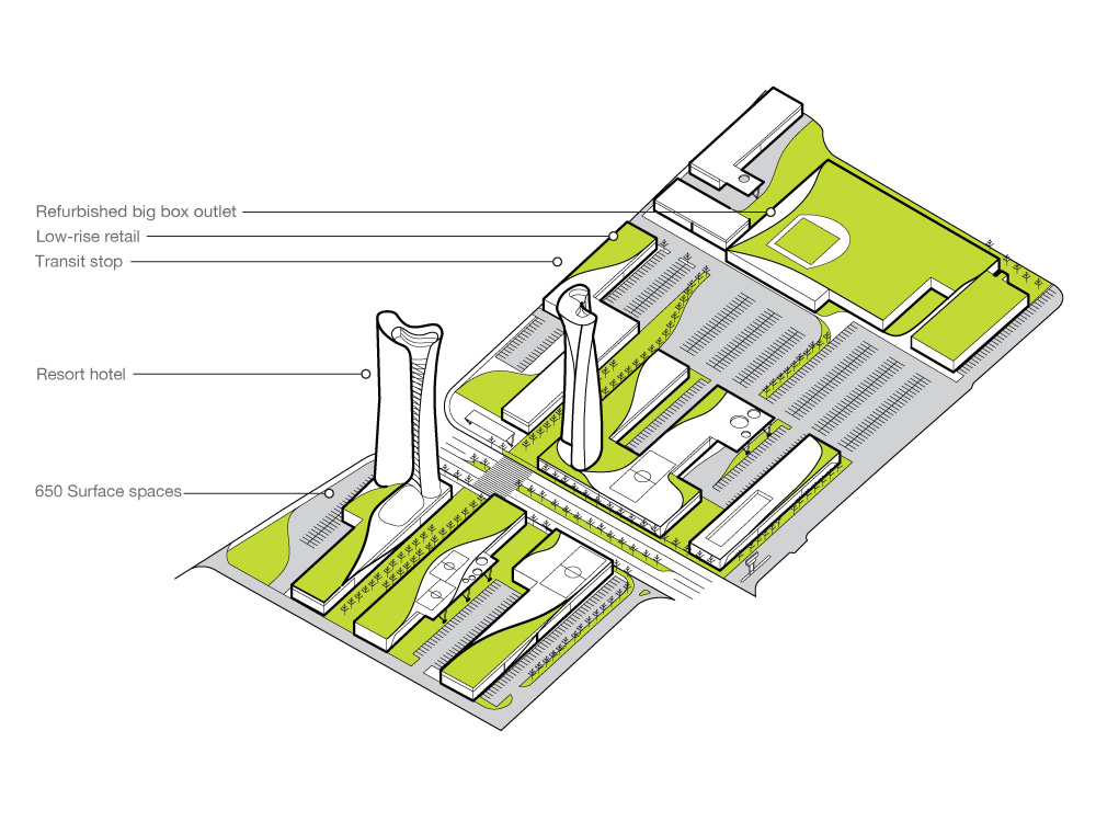 The goal of this studio was to gain a greater understanding of how suburbs function and purpose solutions to the nascent phenomena of suburban blight. A run-down area of suburban Columbus, OH was selected to test the re-thinking of building and planning codes in a way that encourages more vibrant and pedestrian-friendly development served by mass transit. Where New Urbanist-style strategies would prescribe increased density after mass demolition, this proposal seeks to preserve the most adaptable structures and enhance opens space with the insertion of landscape right of ways between parcels. Frontage is key, with new structures required to front either 100% of the street and 25% of the predestrian right of way, or 25% of the street and 100% of right of way.