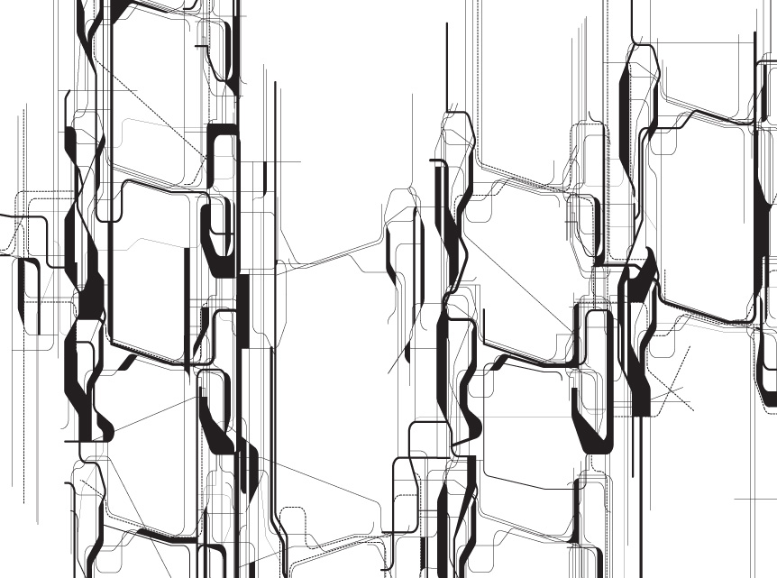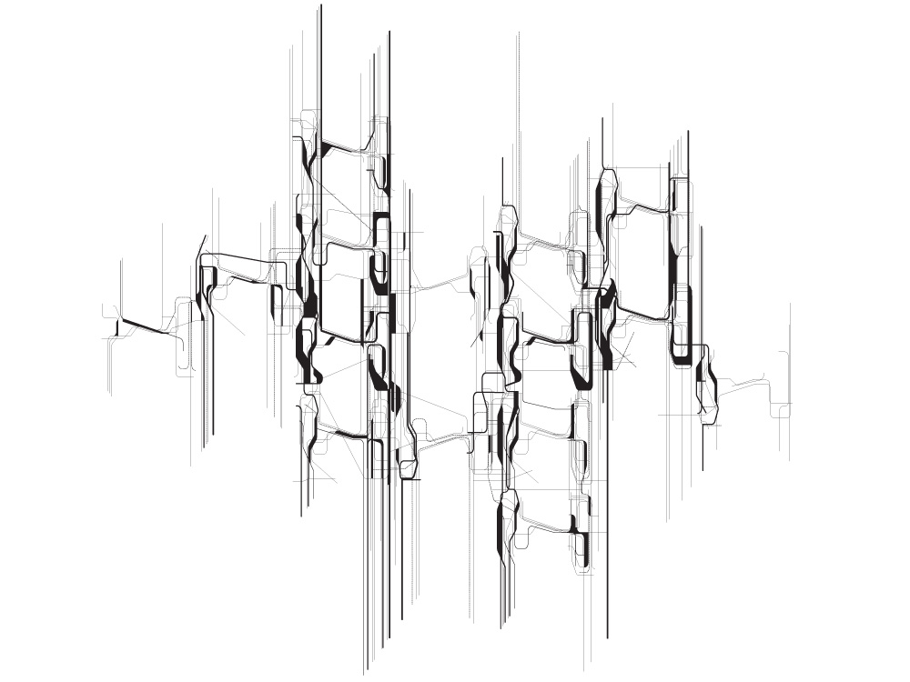 This digital drawing exercise was meant to explore how far the plan of an office space could be abstracted while still maintaining some vestige of architectural form and intent. The end product was an image produced by arraying the office plans into columns and extracting lines and volumes that follow a distinct figural language. The drawing was selected for the 2d3d-2 exhibit based on its potential to a dialogue taking place in architecture about the capabilities and meaning of digital media in drawing. / Line & figure study / Digital / Studio VI / Fall 2009 / Exhibited at 2D3D-2: Drawing in the Post-Digital Age / Woodbury University / Los Angeles, CA, May 2011