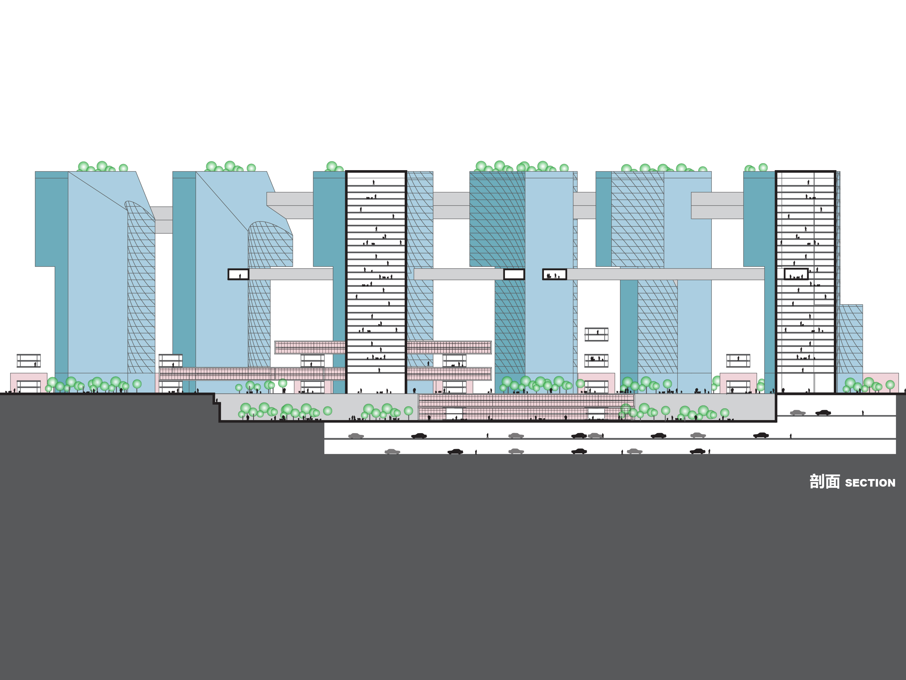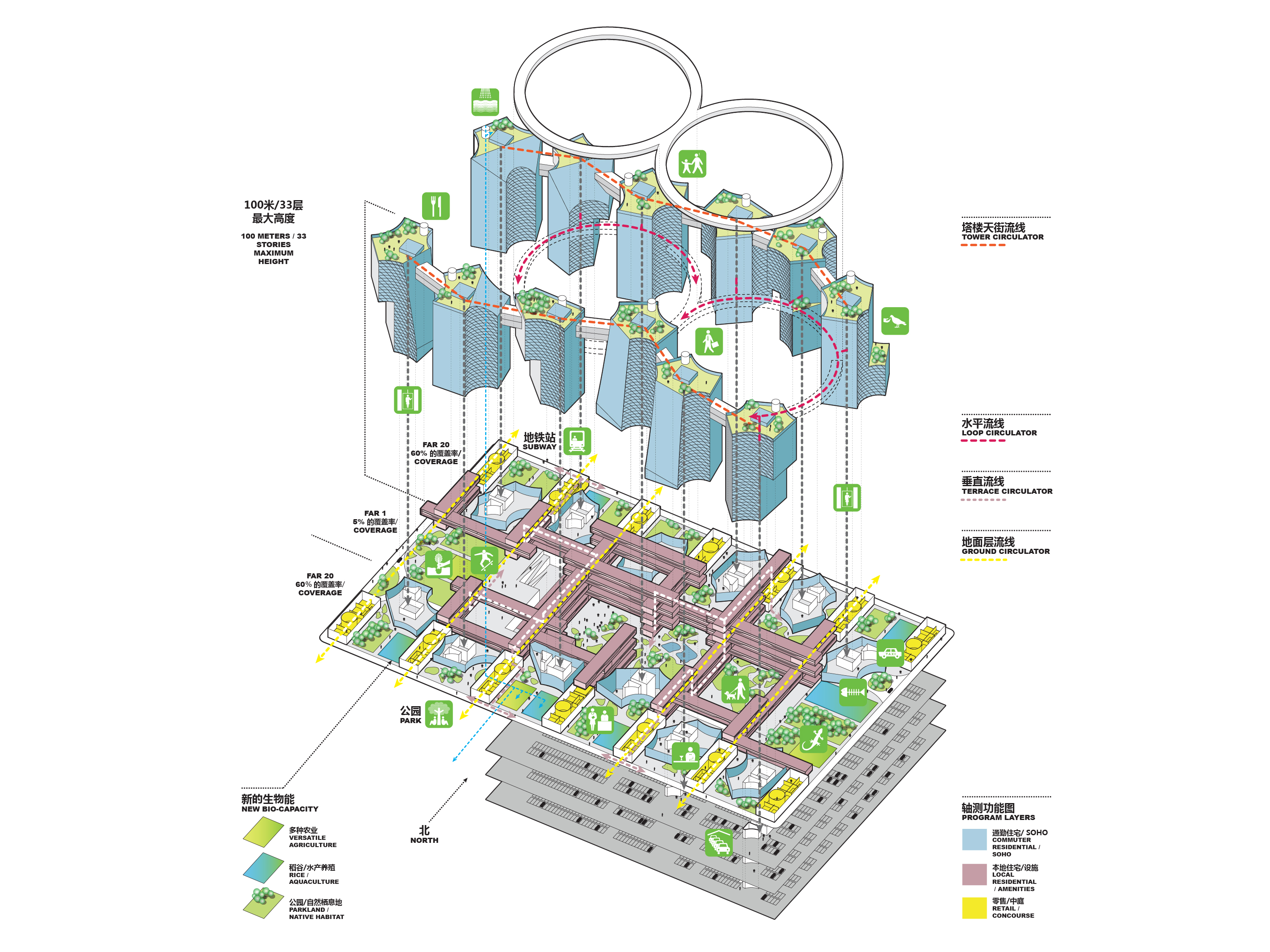 The proposal calls for a layered approach to the modern challenges of density. To accommodate a floor to area ratio of 1:10 on a 10 hectare site with a height limit of 100 meters, the site is divided into three sections at ground level. The north and south are best suited for the highest levels of density on the site because they face a subway station and public park, respectively. They are given an FAR of 1:20 with 60% maximum site coverage. The middle portion of the site is set aside for open space with an FAR of 1:1 with only 5% maximum site coverage. Long, terraced low-rise buildings frame the central plaza and provide homes for people who work locally as well as other amenities. Towers rise from the dense edges of site and house apartments and soho offices for people who need to commute some distance to work.