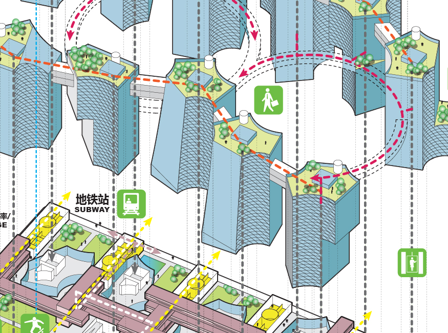 In December 2013, the Shenzhen Design Center launched a small design competition titled ’10x10x100′ that focused on new approaches to density in urban development and the way architects approach FAR (Floor Area Ratio) parameters. As my exclusive project on behalf of FCHA, I sought to offer a comprehensive design response to floor-area ratio and density issues. A variety of social and environmental issues were considered: I determined that housing typologies should be tailored to suit both residents who must commute long distances and those who do not. Transportation and circulation should move beyond the conventional duality of elevators for vertical circulation, and ground-level plazas and sidewalks for horizontal circulation. Perhaps most urgently, the issue of resource-use should be addressed by considering the bio-footprint of large developments. In Shenzhen, the average resident has a bio-footprint that is 47 times the size of the city’s bio-capacity!