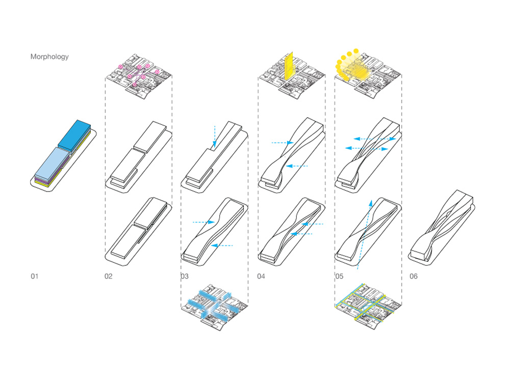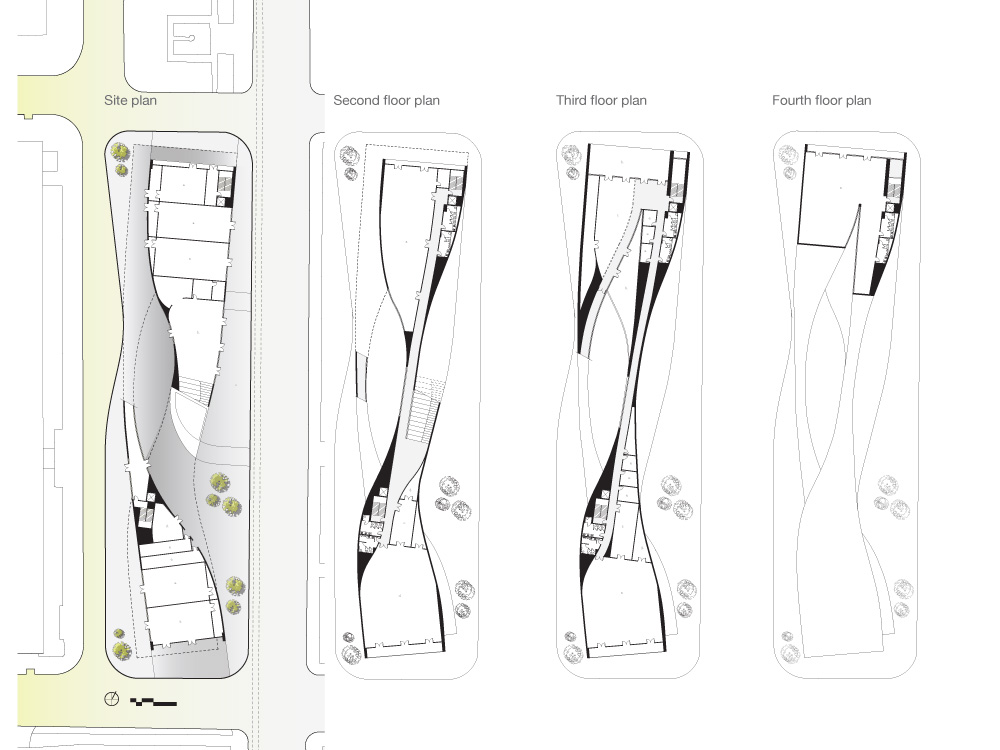 In the Summer of 2010, a coalition of community groups in Charleston, SC organized a design competition for the central hub of a new light rail system. Public meeting/banquet space, storefronts for local merchants, and badly needed affordable office space were all popular popular programmatic requirements. The entire ground floor is devoted to transit and retail space, allowing the office and meeting spaces to occupy the upper floors. The programmatic blocks were then split into two volumetric entities. The long expanse of wall on both sizes of the second volume was squeezed in to diminish its imposing nature while maintaining the buildup of the urban edge condition at both ends of theblock. Glare-free, indirect daylighting for the offices and meeting spaces was provided by bifurcating the first volume and lining it with glass.