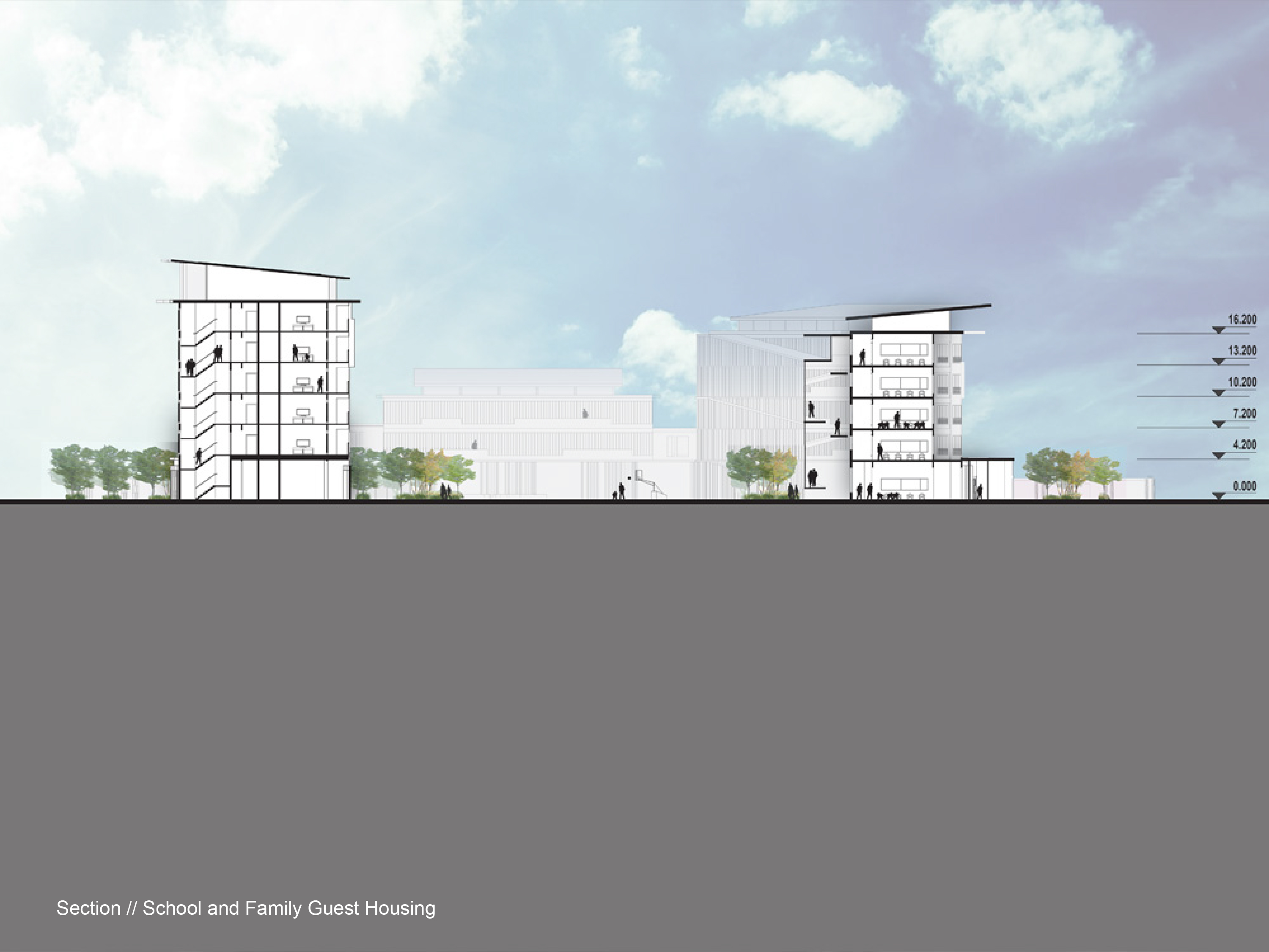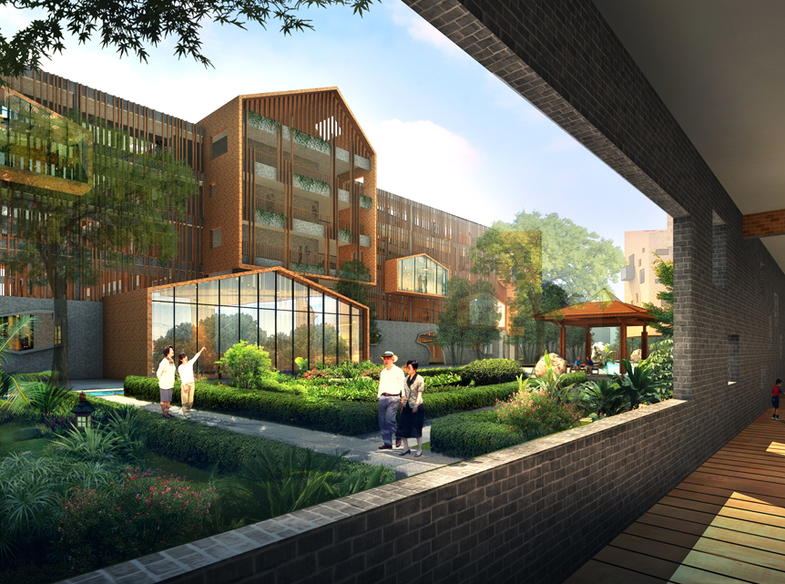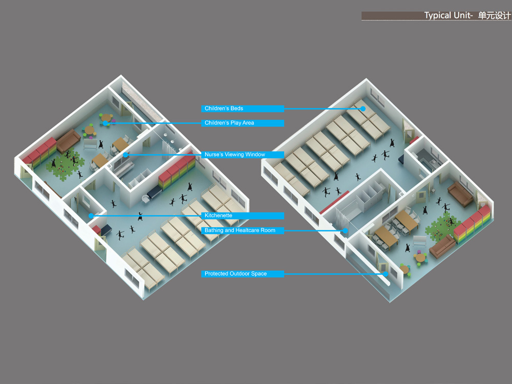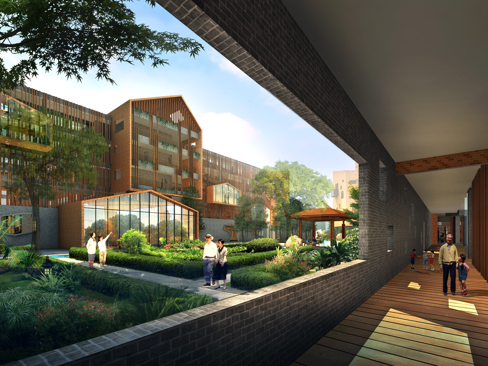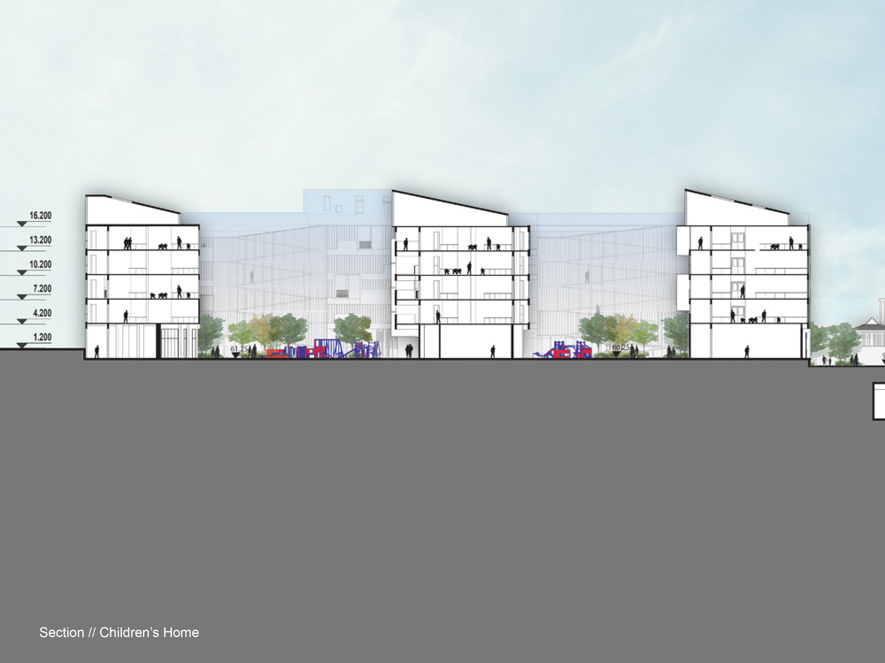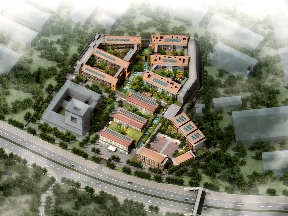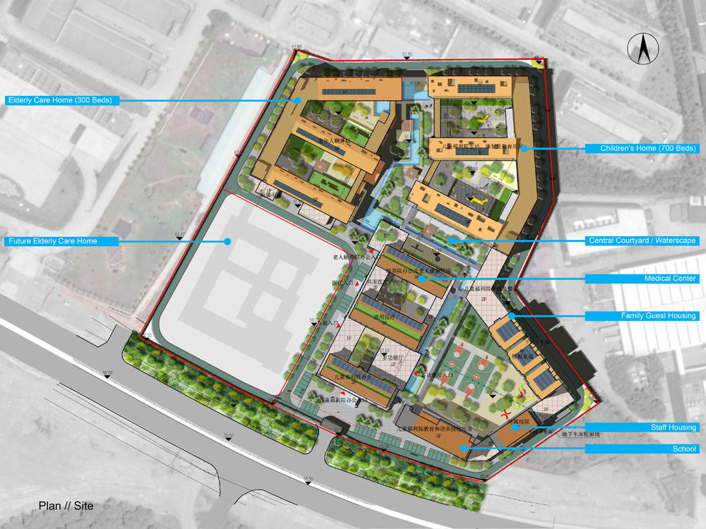 This competition project involved the consideration of a complex list of programmatic requirements. At its core, the Social Welfare Institute will provide a home for over 300 elderly people in its first phase, and 700 children with special needs. The residential components will be supported by a large medical center, a school, a guesthouse, and numerous recreation facilities. The relatively compact site is in the middle of a transitioning industrial zone that will be ringed by an access road for all of the new buildings’ support functions. To enhance efficiency and safety, the site is organized into three semi-autonomous cores: one for the elderly care home, one for the children’s home, and one for the medical center and other support buildings. Each core is self-contained in the amenities it offers its residents, but all are connected by a central waterscape courtyard that binds the site into a cohesive whole.