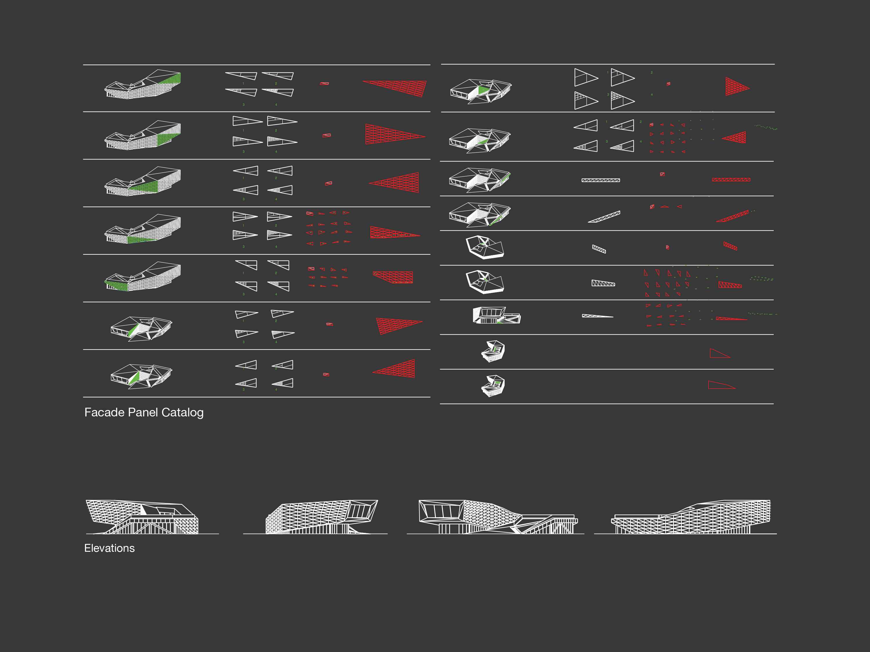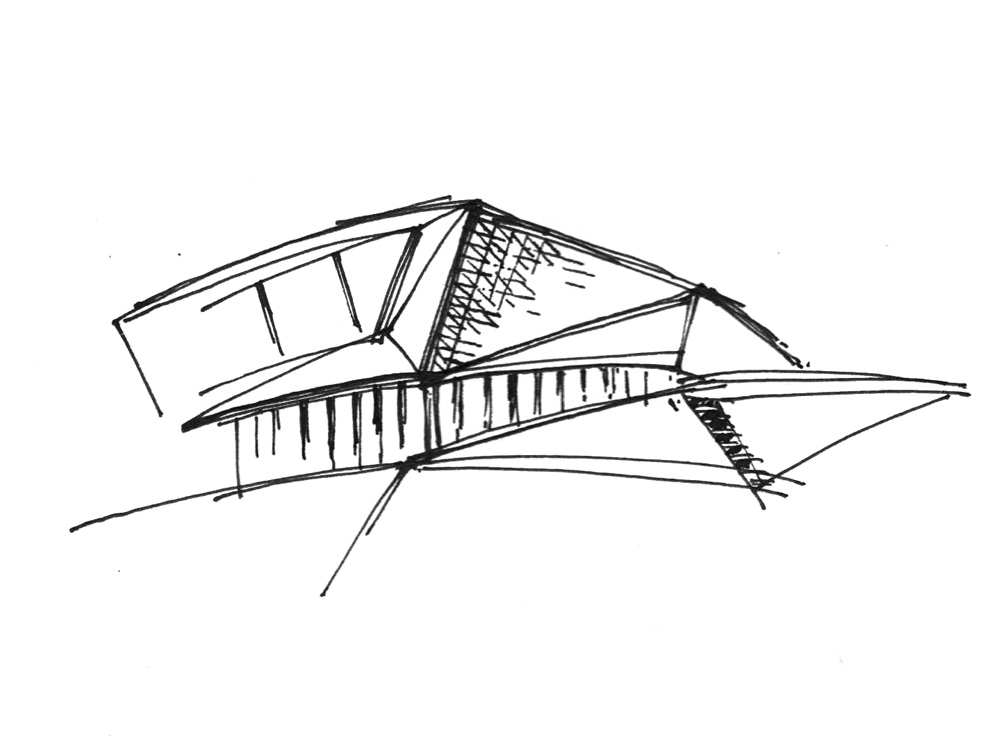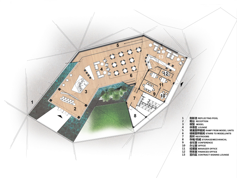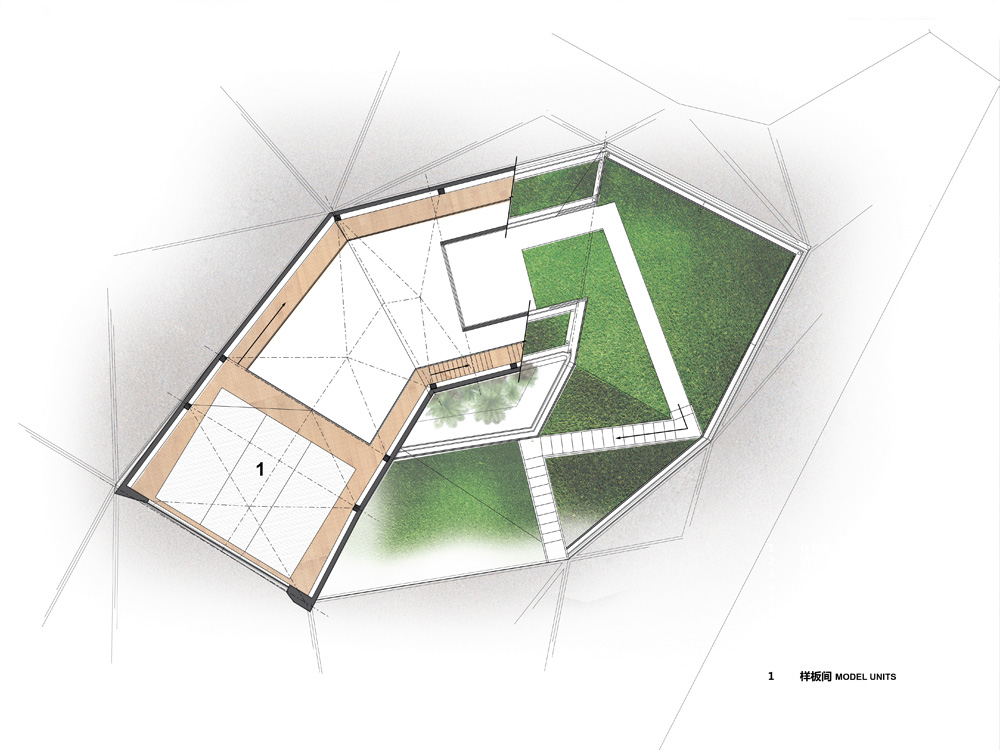 The corner of the site where the office will be situated is surrounded by ongoing or upcoming development, meaning there were very few physical adjacencies to influence the organization of program. In light of this, a loose triangular grid was imposed across the site to form the parameters of a plaza landscape. The center of that landscape grid was then extruded into two levels connected by gentle slopes, to form an active and useable green roof. The two-level portion of the mass takes the form of a cantilevered box-truss which will house the office’s three model units. The balconies of the model units will face a large glazed-facade looking out to the side of the site that many of the actual tower units will face. Opposite the model units will be a fluid and inviting double-height space for the office’s main sales lounge, which will be bathed in diffuse Northern daylight by a large inverted dormer window.