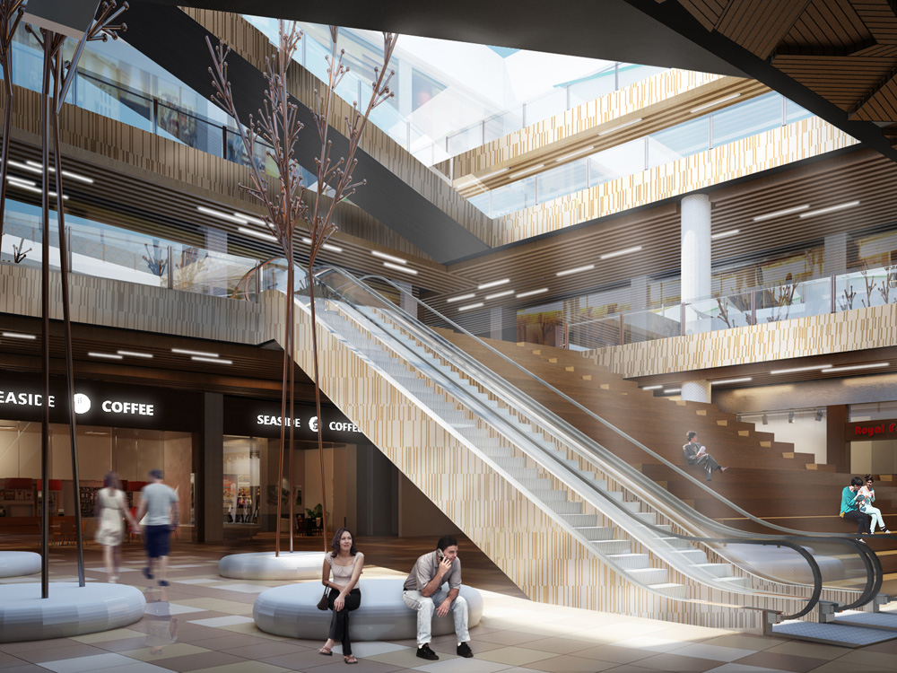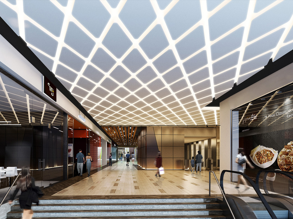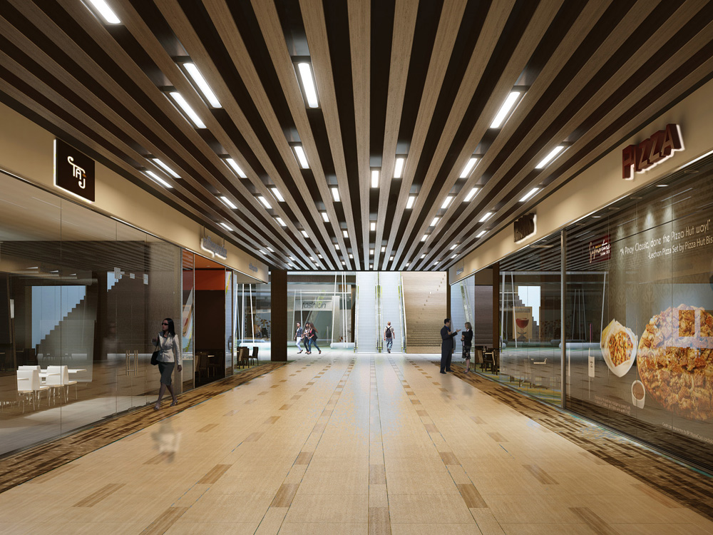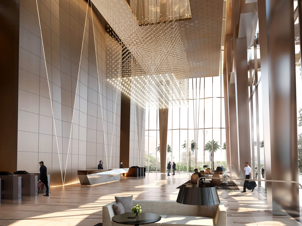 The interior design of Hongtu plaza involved creating a highly- coordinated and deliberate sequence of spaces flexible to the formality or informality of their programming. The tower’s main foyer will feature grand gestures; such as rich champagne-hued tiles and metal paneling on the ceilings and walls, accented by sleek furniture and large cubic array chandelier. The design of the retail spaces sought to create inviting, flowing spaces with directional batton ceilings and a sleek backlit diamond ceiling around the metro entrance. The northern half of the podium is centered on an open-air court that was given a palette of copper and cream-toned metals and tiles. These surface materials exude a casual luxury that relates to the grandeur of the spaces in the tower’s base. The top floor headquarters office was given the same level of attention and finesse to communicate an understated elegance. Completion of the entire complex is scheduled for late 2016.