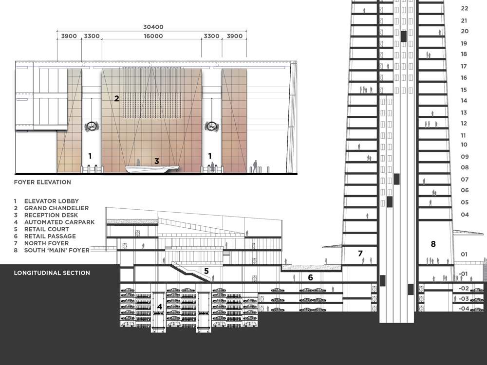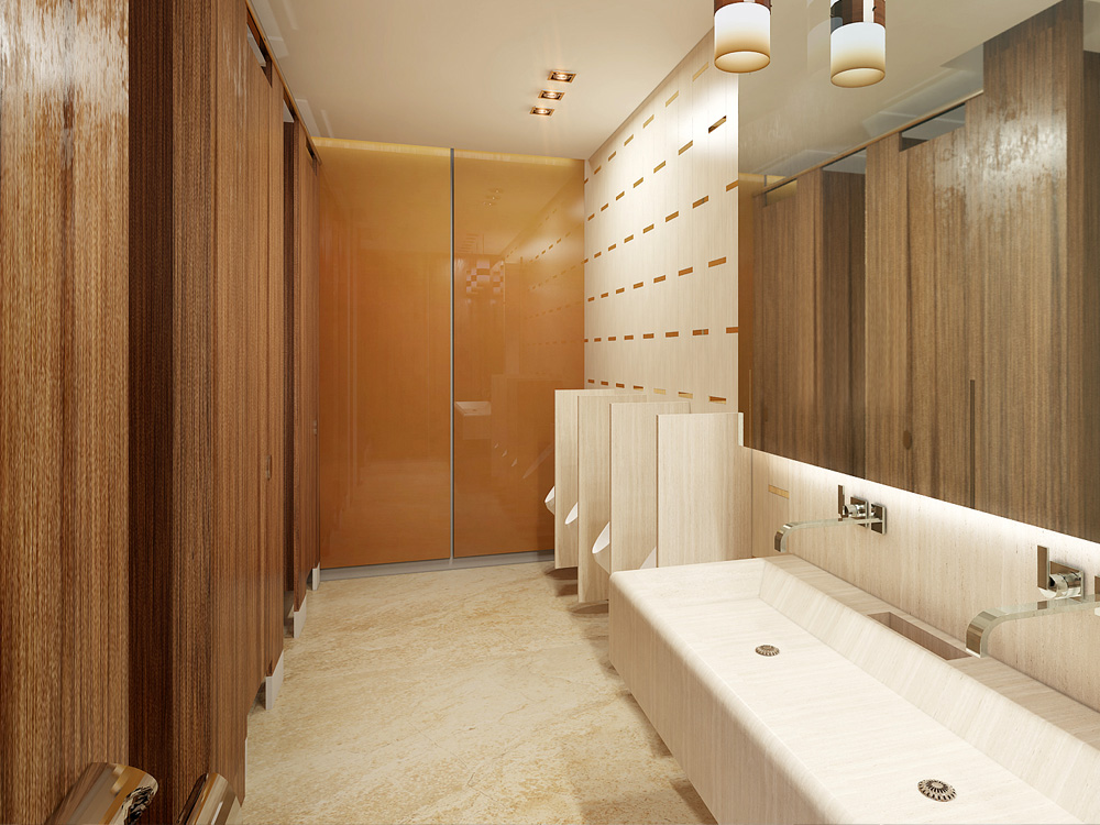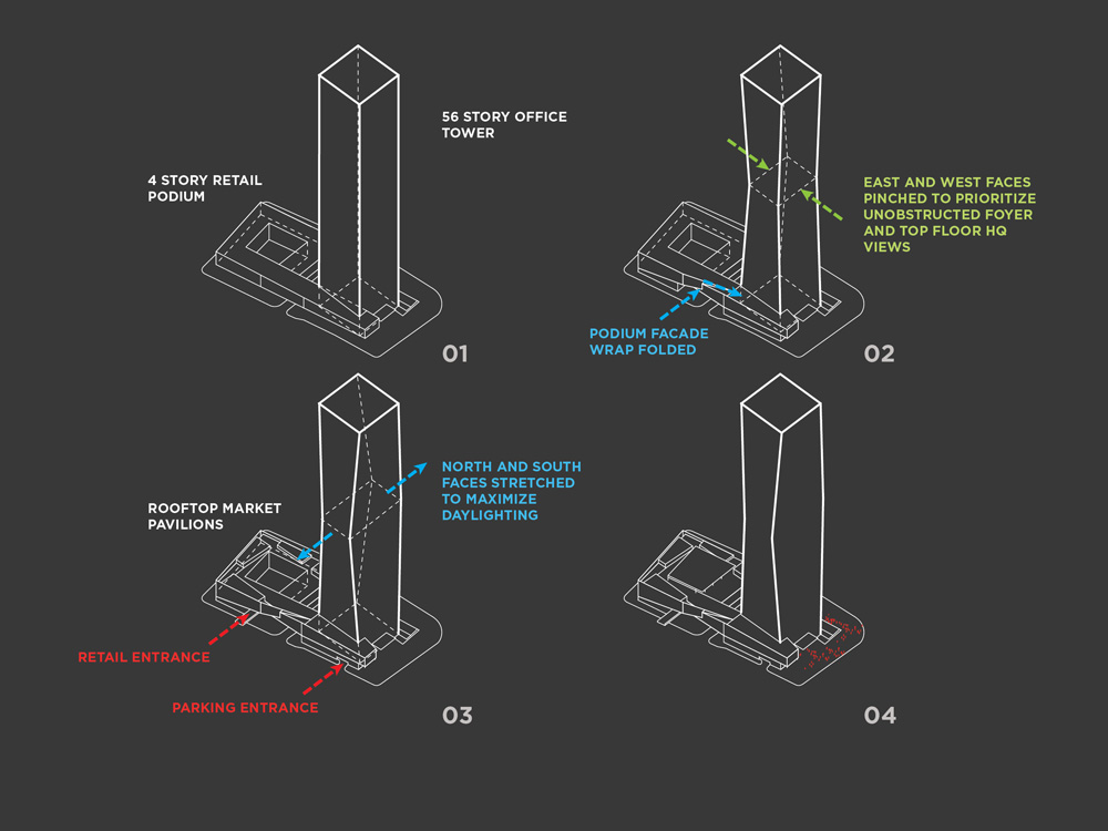 The result was an intriguing form for the shaft which then served as the inspiration for the three-dimensional diamond geometry of the tower facade. The geometry of the retail podium was allowed to take on a different character of folded and shifting solids appropriate for its horizontality. My involvement in this project primarily focused on the design, modeling, rendering, and coordination of the building’s interiors. I was enthusiastic about the opportunity to deliver high-quality spaces and materials that reflected the prestige of the client firm.